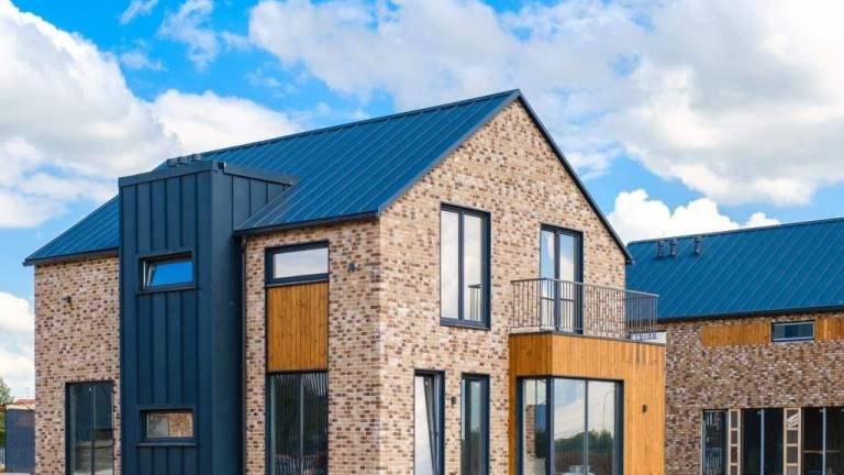 Большой двухэтажный дом 822 м в современном стиле построен на лесном участке с сильным перепадом высот. Фасад с панорамными окнами и балконами облицован темным...