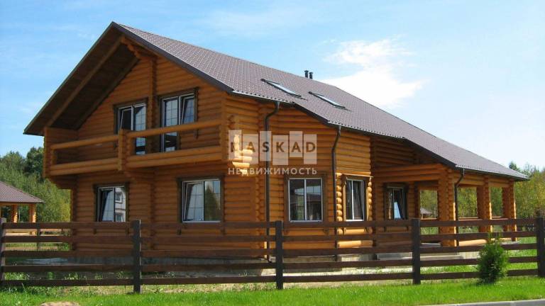 Экологичный дом из бревна с балконом и террасой в центре поселка у живописного фонтана. В благоустроенном, охраняемом коттеджном поселке «Троица...