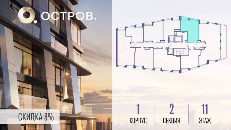 Продаётся 1-комн. квартира от застройщика: общая площадь 44.30 м, жилая 14.20 м, кухня 21.10 м, 21-й этаж, жилой квартал «Остров 12», корпус 3 (секция 1) .