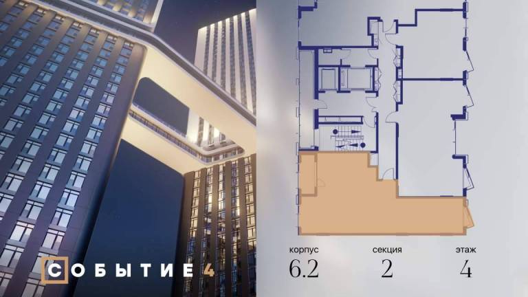 Продаётся 2-комнатная квартира от застройщика: общая площадь 62.20 м, жилая 32.60 м, кухня 17.80 м, 15-й этаж, жилой квартал «Событие-6», корпус 2 (секция 5...