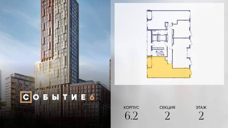 Продаётся 2-комнатная квартира от застройщика: общая площадь 61.90 м, жилая 33.00 м, кухня 17.80 м, 35-й этаж, жилой квартал «Событие-6», корпус 2 (секция 5...