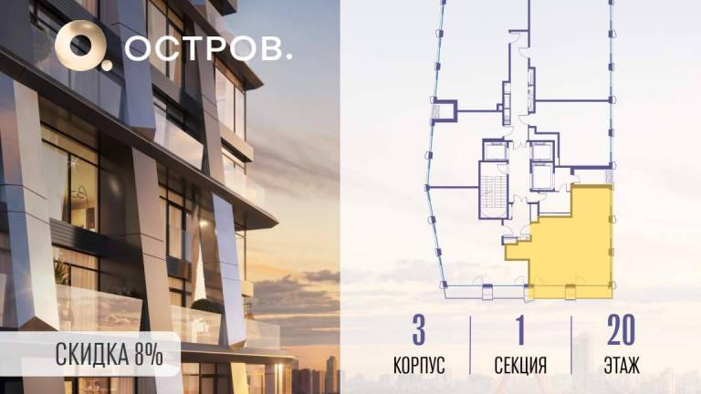 Фильтры1Продаётся 2-комн. квартира от застройщика: общая площадь 76.40 м, жилая 28.30 м, кухня 26.90 м, 20-й этаж, жилой квартал «Остров 12», корпус 3 (секция 1) .