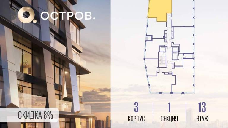 Продаётся 2-комн. квартира от застройщика: общая площадь 66.70 м, жилая 24.20 м, кухня 22.40 м, 13-й этаж, жилой квартал «Остров 12», корпус 1 (секция 2) .