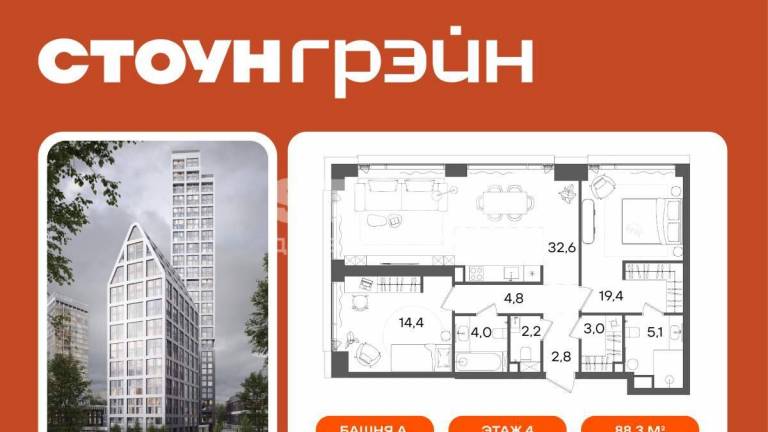 Старт продаж квартир в ЖК бизнес+ класса от девелопера STONE В продаже функциональная и светлая двуспальная квартира с кухней-гостиной, террасой, двумя...