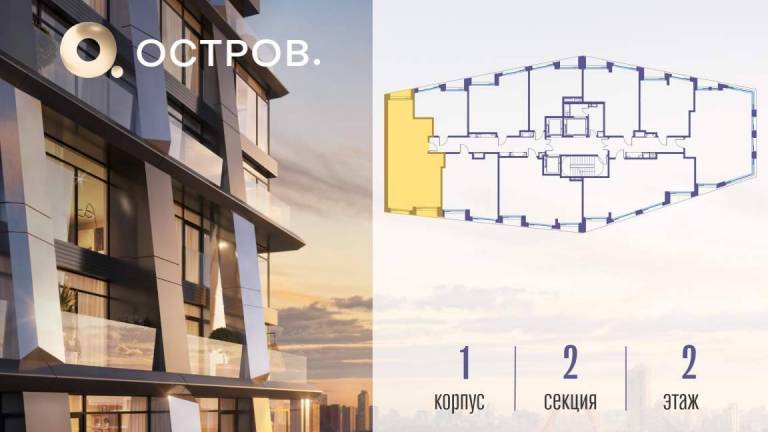 Продаётся 2-комн. квартира от застройщика: общая площадь 66.70 м, жилая 24.20 м, кухня 22.40 м, 13-й этаж, жилой квартал «Остров 12», корпус 1 (секция 2) .