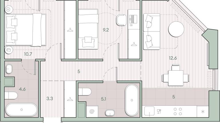Двухуровневые апартаменты со свободной планировкой. Лот без отделки. Планировка 1 – предлагаемое планировочное решение: 2 спальни, кухня-гостиная...