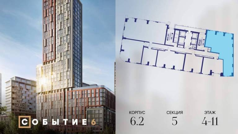 Продаётся 3-комнатная квартира от застройщика: общая площадь 99.20 м, жилая 41.70 м, кухня 23.20 м, 6-й этаж, жилой квартал «Событие-6», корпус 2 (секция 1...