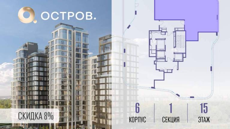 Продаётся 4-комн. квартира от застройщика: общая площадь 123.50 м, жилая 50.30 м, кухня 37.20 м, 6-й этаж, жилой квартал «Остров 12», корпус 1 (секция 2) .