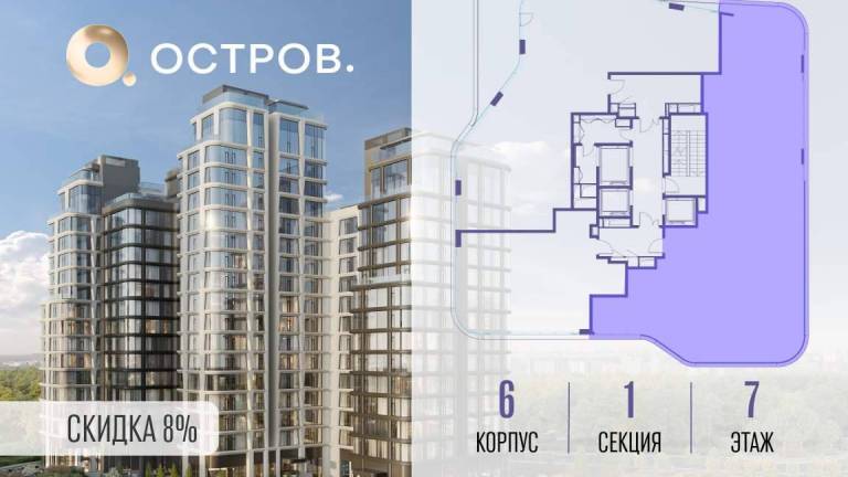 Продаётся 4-комн. квартира от застройщика: общая площадь 123.50 м, жилая 50.30 м, кухня 37.20 м, 6-й этаж, жилой квартал «Остров 12», корпус 1 (секция 2) .