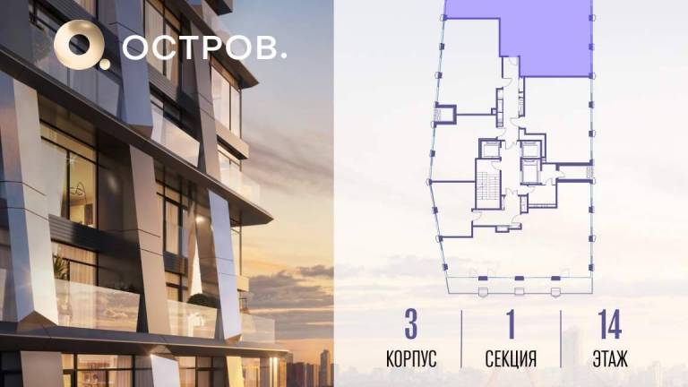 Продаётся 3-комн. квартира от застройщика: общая площадь 104.00 м, жилая 43.40 м, кухня 31.40 м, 14-й этаж, жилой квартал «Остров 12», корпус 2 (секция 1) .