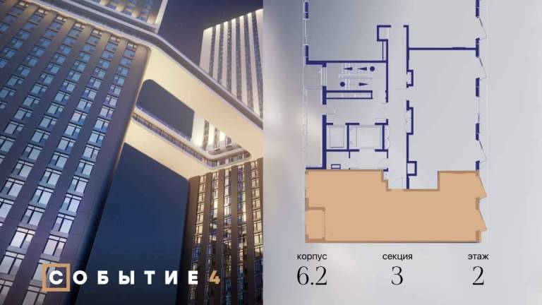 Продаётся 2-комнатная квартира от застройщика: общая площадь 61.90 м, жилая 33.00 м, кухня 17.80 м, 35-й этаж, жилой квартал «Событие-6», корпус 2 (секция 5...