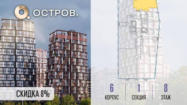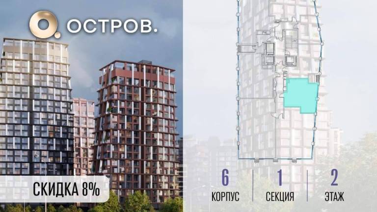 Продаётся 2-комн. квартира от застройщика: общая площадь 63.10 м, жилая 27.50 м, кухня 22.40 м, 10-й этаж, жилой квартал «Остров 14», корпус 1 (секция 2) .