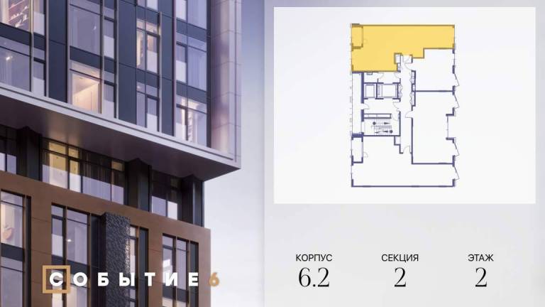 Продаётся 2-комнатная квартира от застройщика: общая площадь 61.90 м, жилая 33.00 м, кухня 17.80 м, 35-й этаж, жилой квартал «Событие-6», корпус 2 (секция 5...