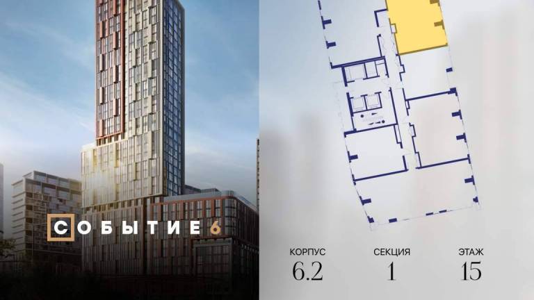 Продаётся 1-комнатная квартира от застройщика: общая площадь 38.80 м, жилая 14.90 м, кухня 16.00 м, 26-й этаж, жилой квартал «Событие-6», корпус 2 (секция 5...
