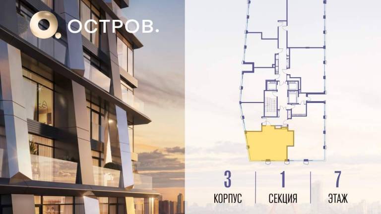 Продаётся 3-комн. квартира от застройщика: общая площадь 128.20 м, жилая 36.20 м, кухня 35.80 м, 15-й этаж, жилой квартал «Остров 7», корпус 2 (секция 2) .
