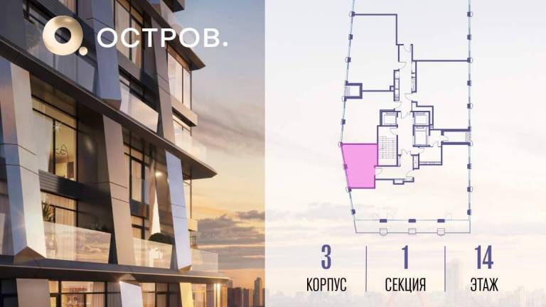 Продаётся 1-комн. квартира от застройщика: общая площадь 42.60 м, жилая 14.70 м, кухня 19.70 м, 17-й этаж, жилой квартал «Остров 14», корпус 6 (секция 1) .