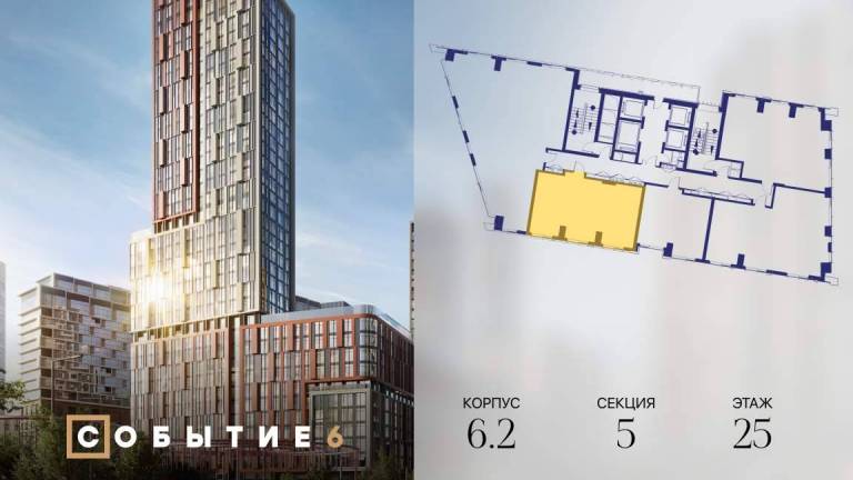 Продаётся 2-комнатная квартира от застройщика: общая площадь 61.90 м, жилая 33.00 м, кухня 17.80 м, 35-й этаж, жилой квартал «Событие-6», корпус 2 (секция 5...