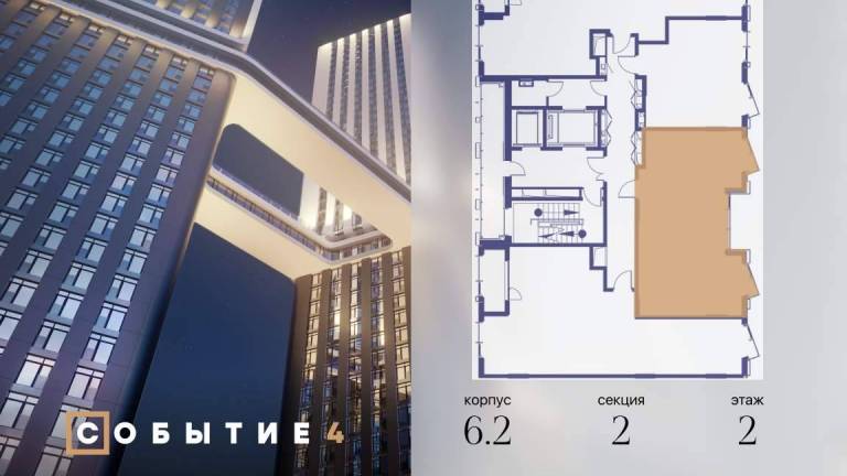 Продаётся 2-комнатная квартира от застройщика: общая площадь 62.20 м, жилая 32.60 м, кухня 17.80 м, 15-й этаж, жилой квартал «Событие-6», корпус 2 (секция 5...