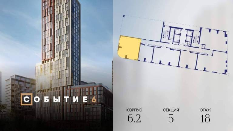 Продаётся 2-комнатная квартира от застройщика: общая площадь 64.30 м, жилая 26.30 м, кухня 20.60 м, 9-й этаж, жилой квартал «Событие-6», корпус 2 (секция 5...