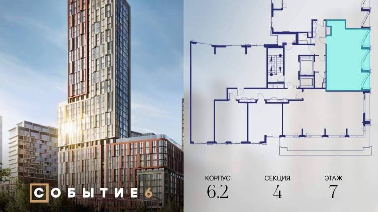 Продаётся 4-комнатная квартира от застройщика: общая площадь 130.80 м, жилая 59.90 м, кухня 28.10 м, 32-й этаж, жилой квартал «Событие-6», корпус 2 (секция 5...