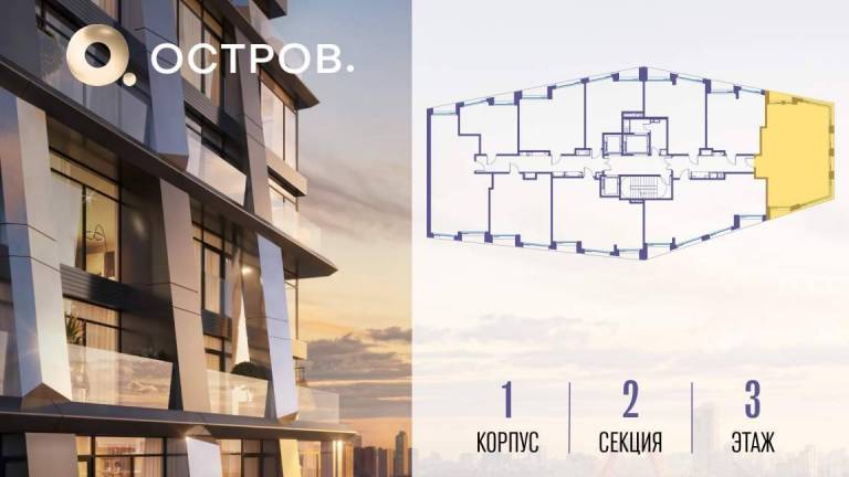 Продаётся 3-комн. квартира от застройщика: общая площадь 107.10 м, жилая 50.30 м, кухня 30.10 м, 2-й этаж, жилой квартал «Остров 12», корпус 1 (секция 1) .