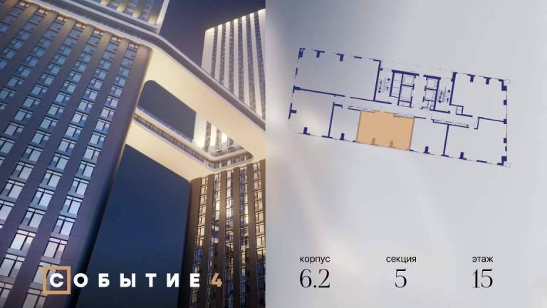 Фильтры2Продаётся 2-комнатная квартира от застройщика: общая площадь 62.20 м, жилая 32.60 м, кухня 17.80 м, 15-й этаж, жилой квартал «Событие-6», корпус 2 (секция 5...