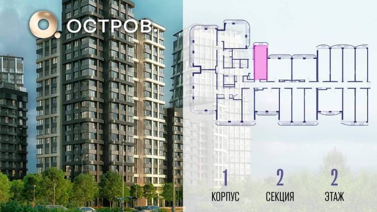Продаётся 1-комн. квартира от застройщика: общая площадь 38.60 м, жилая 14.10 м, кухня 18.20 м, 16-й этаж, жилой квартал «Остров 14», корпус 1 (секция 2) .