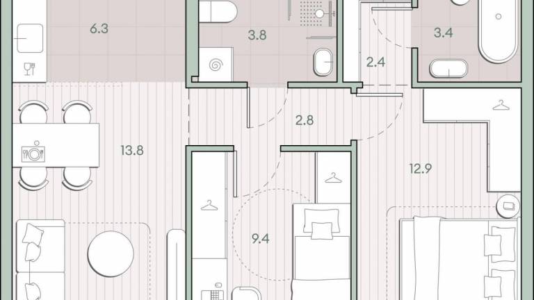 Продаётся 4-комн. квартира от застройщика: общая площадь 132.10 м, жилая 61.10 м, кухня 25.70 м, 16-й этаж, жилой квартал «Остров 12», корпус 3 (секция 1) .