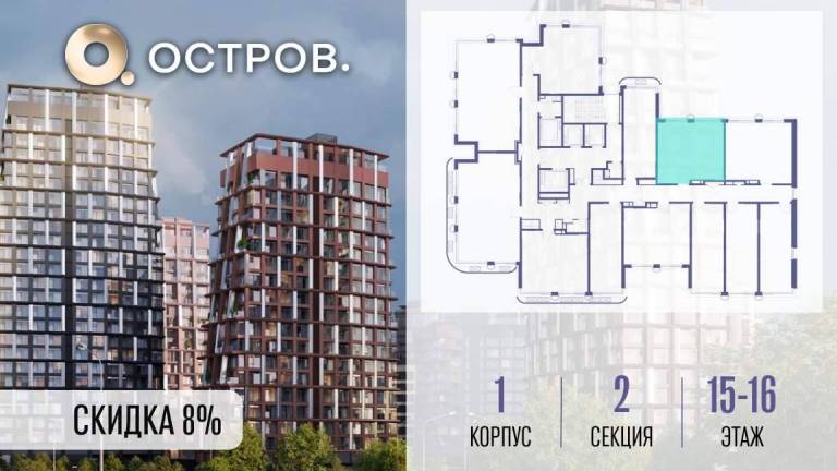 Продаётся 2-комн. квартира от застройщика: общая площадь 63.10 м, жилая 27.50 м, кухня 22.40 м, 15-й этаж, жилой квартал «Остров 14», корпус 1 (секция 2) .