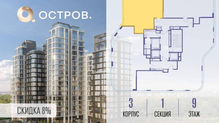 Продаётся 3-комн. квартира от застройщика: общая площадь 119.40 м, жилая 40.90 м, кухня 38.80 м, 18-й этаж, жилой квартал «Остров 7», корпус 6 (секция 2) .