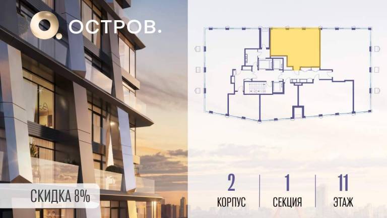 Продаётся 1-комн. квартира от застройщика: общая площадь 44.30 м, жилая 14.20 м, кухня 21.10 м, 21-й этаж, жилой квартал «Остров 12», корпус 3 (секция 1) .