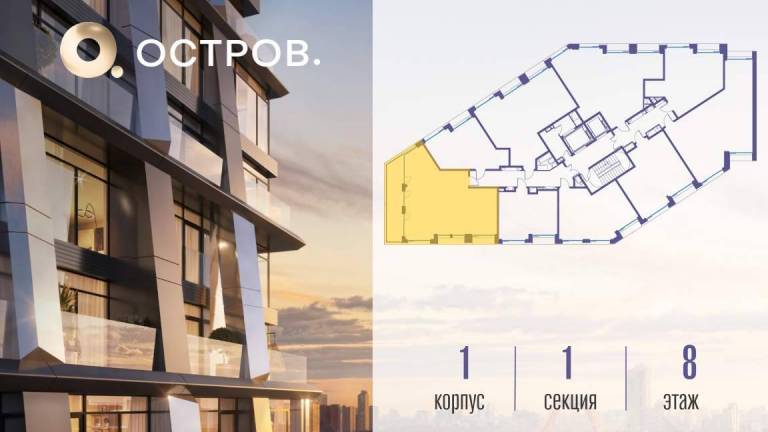 Продаётся 1-комн. квартира от застройщика: общая площадь 42.60 м, жилая 14.70 м, кухня 19.20 м, 19-й этаж, жилой квартал «Остров 12», корпус 3 (секция 1) .