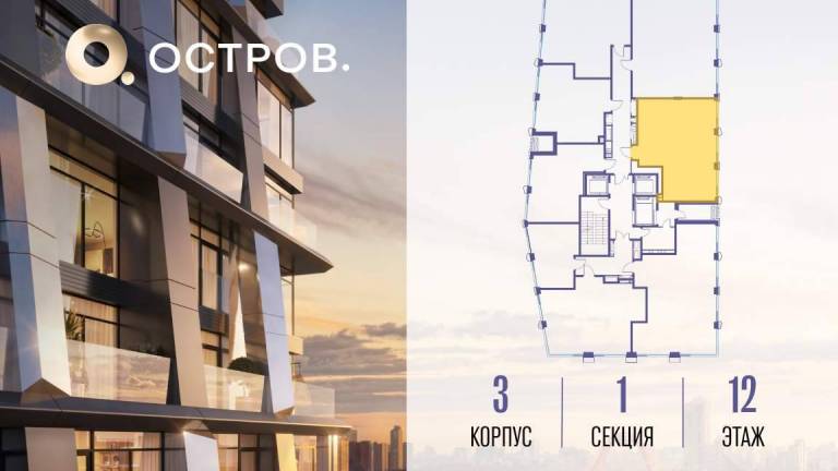 Продаётся 3-комн. квартира от застройщика: общая площадь 105.10 м, жилая 38.90 м, кухня 28.80 м, 7-й этаж, жилой квартал «Остров 12», корпус 1 (секция 2) .