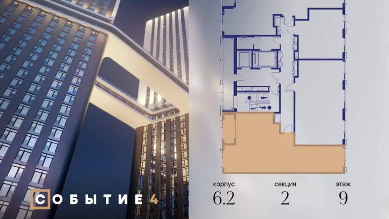 Продаётся 3-комнатная квартира от застройщика: общая площадь 77.00 м, жилая 41.90 м, кухня 17.60 м, 32-й этаж, жилой квартал «Событие-6», корпус 2 (секция 5...