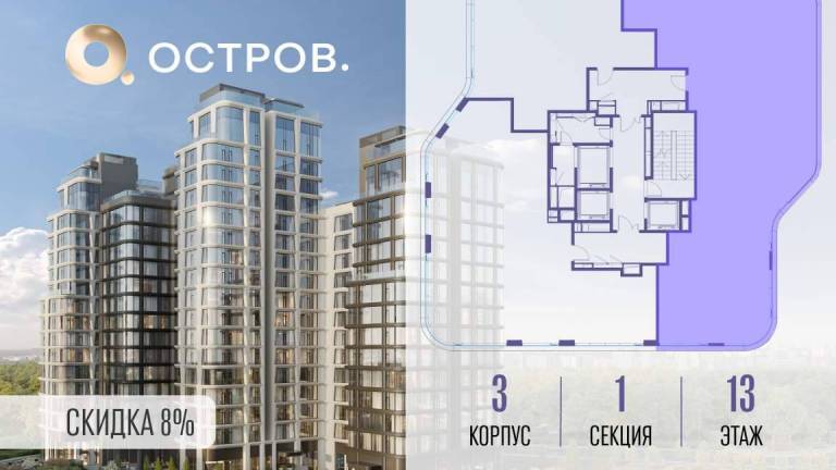Продаётся 2-комн. квартира от застройщика: общая площадь 75.80 м, жилая 30.80 м, кухня 32.00 м, 13-й этаж, жилой квартал «Остров 12», корпус 1 (секция 3) .