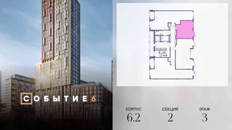 Продаётся 3-комнатная квартира от застройщика: общая площадь 99.70 м, жилая 42.00 м, кухня 23.20 м, 20-й этаж, жилой квартал «Событие-6», корпус 2 (секция 1...