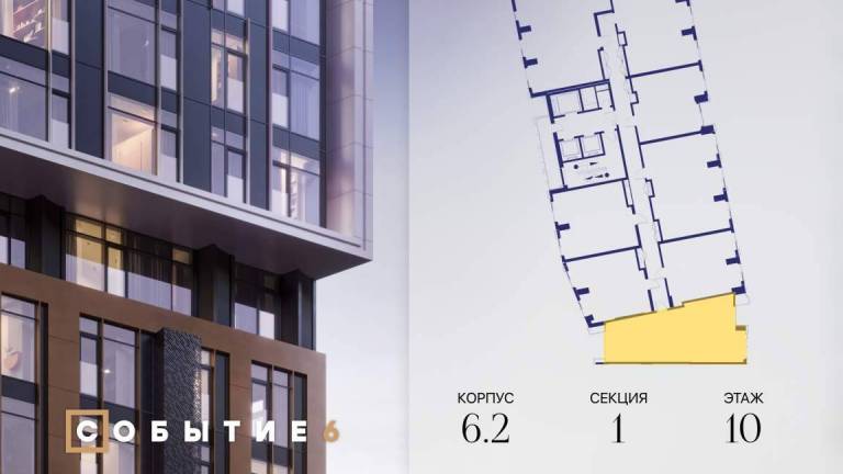 Продаётся 1-комнатная квартира от застройщика: общая площадь 44.80 м, жилая 17.00 м, кухня 20.20 м, 26-й этаж, жилой квартал «Событие-6», корпус 2 (секция 1...
