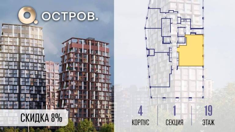 Продаётся 4-комн. квартира от застройщика: общая площадь 128.60 м, жилая 48.10 м, кухня 44.70 м, 17-й этаж, жилой квартал «Остров 7», корпус 4 (секция 2) .