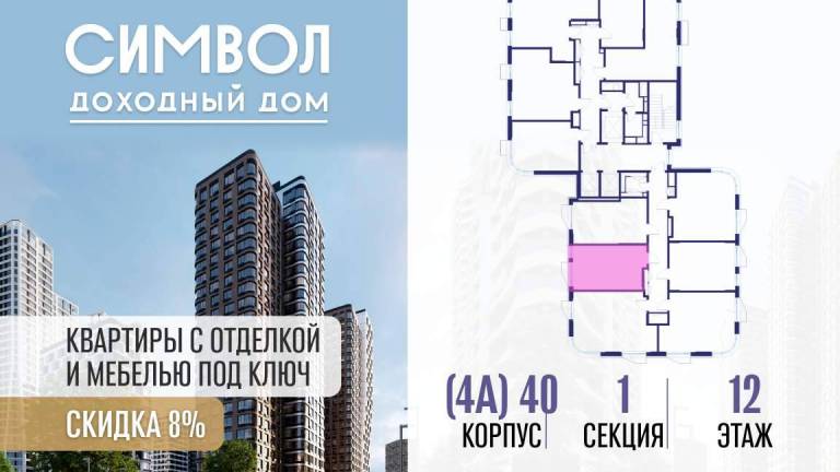 Продается квартира-студия от застройщика: общая площадь 28.00 м, жилая 15.90 м, кухня 5.00 м, 8-й этаж, жилой квартал «Гордость», корпус 40 (секция 1) . Срок...