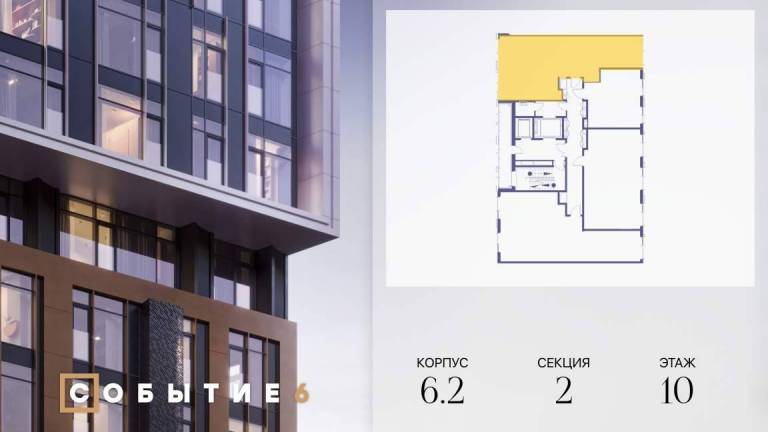 Продаётся 2-комнатная квартира от застройщика: общая площадь 62.10 м, жилая 33.00 м, кухня 17.80 м, 37-й этаж, жилой квартал «Событие-6», корпус 2 (секция 5...