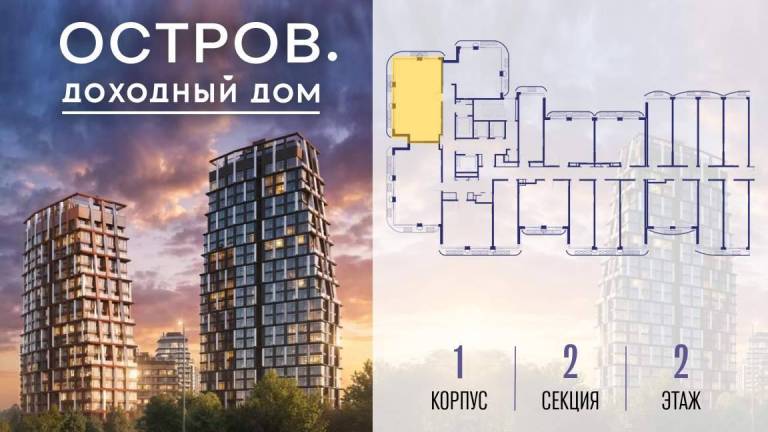 Продаётся 2-комн. квартира от застройщика: общая площадь 63.10 м, жилая 27.50 м, кухня 22.40 м, 16-й этаж, жилой квартал «Остров 14», корпус 1 (секция 2) .