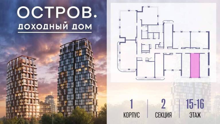 Продаётся 1-комн. квартира от застройщика: общая площадь 38.80 м, жилая 14.10 м, кухня 18.30 м, 15-й этаж, жилой квартал «Остров 14», корпус 1 (секция 2) .