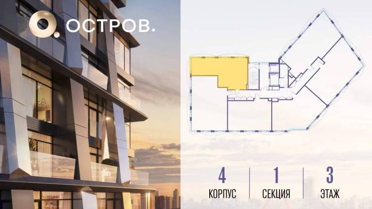 Продаётся 4-комн. квартира от застройщика: общая площадь 113.40 м, жилая 57.20 м, кухня 23.70 м, 3-й этаж, жилой квартал «Остров 12», корпус 3 (секция 1) .