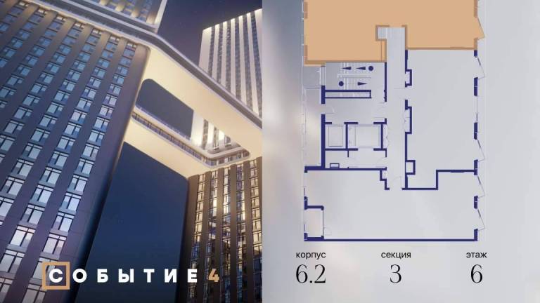 Продаётся 2-комнатная квартира от застройщика: общая площадь 61.80 м, жилая 32.90 м, кухня 17.80 м, 28-й этаж, жилой квартал «Событие-6», корпус 2 (секция 5...