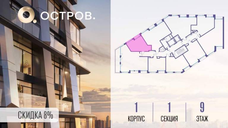 Продаётся 1-комн. квартира от застройщика: общая площадь 42.60 м, жилая 14.70 м, кухня 19.20 м, 17-й этаж, жилой квартал «Остров 12», корпус 3 (секция 1) .