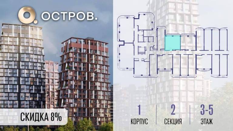 Продаётся 2-комн. квартира от застройщика: общая площадь 63.10 м, жилая 27.50 м, кухня 22.40 м, 16-й этаж, жилой квартал «Остров 14», корпус 1 (секция 2) .