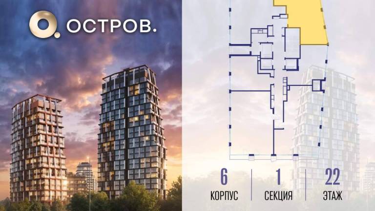 Продаётся 3-комн. квартира от застройщика: общая площадь 87.60 м, жилая 44.00 м, кухня 22.20 м, 11-й этаж, жилой квартал «Остров 14», корпус 6 (секция 1) .