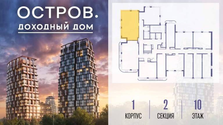Продаётся 2-комн. квартира от застройщика: общая площадь 63.10 м, жилая 27.50 м, кухня 22.40 м, 10-й этаж, жилой квартал «Остров 14», корпус 1 (секция 2) .