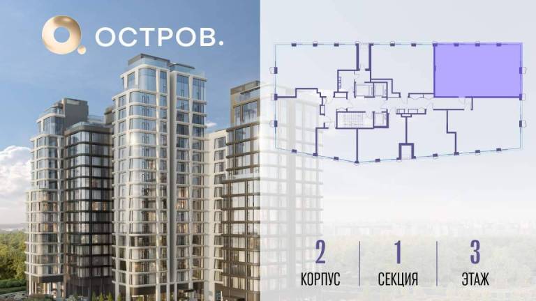 Продаётся 2-комн. квартира от застройщика: общая площадь 73.90 м, жилая 24.80 м, кухня 21.30 м, 16-й этаж, жилой квартал «Остров 12», корпус 3 (секция 1) .