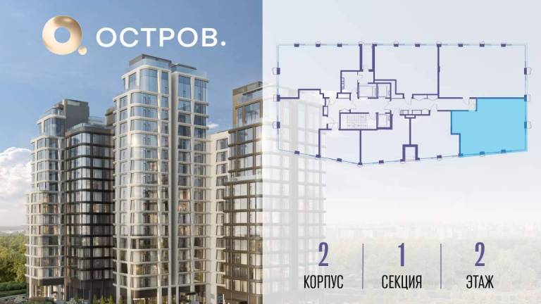 Продаётся 2-комн. квартира от застройщика: общая площадь 72.70 м, жилая 26.40 м, кухня 27.20 м, 10-й этаж, жилой квартал «Остров 12», корпус 1 (секция 2) .
